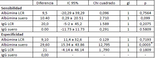 Como el objetivo del trabajo fue evaluar la sensibilidad y la especificidad de la modificación introducida en comparación con la propia de la placa original se compararon los resultados de la cuantificación por ambas formas para albúmina e IgG en suero y LCR.