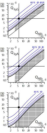 Case report: IgA, IgM, IgG and albumin levels in serum and cerebrospinal fluid were quantified by using a radial immunodiffusion technique. Results were placed in the corresponding reibergram. The patient showed evidences of intrathecal synthesis of the three major immunoglobulins without blood-CSF barrier dysfunction.