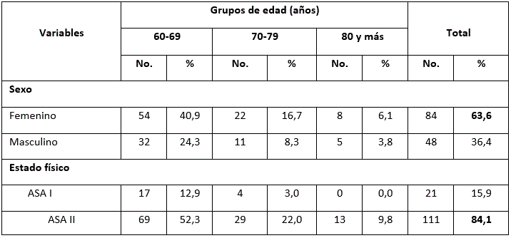 De un total de 132 pacientes geriátricos estudiados predominó el grupo etario correspondiente a los 60 - 69 (65,2%), el sexo femenino (63,6%) y el estado físico ASA II en un 84,1%. (Tabla 1)