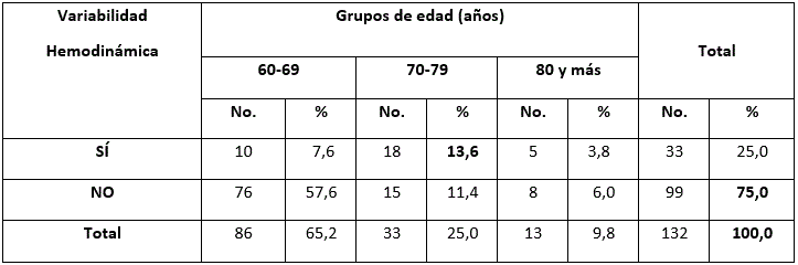 La mayor parte de los pacientes no sufrieron cambios hemodinámicos (75%); sin embargo, se presentaron algunas variabilidades hemodinámicas en 25% de los casos. De ellos el mayor porciento estuvo representado por el grupo de 70-79 años de edad (13,6%). La diferencia en la variabilidad hemodinámica entre los grupos etarios resultó altamente significativa. (Tabla 2).