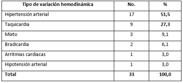 La hipertensión arterial y la taquicardia fueron las variaciones hemodinámicas más frecuentes, con 51,5% y 27,3% respectivamente. (Tabla 3)