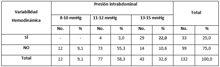 En la mayoría de los ancianos (58,3%) se utilizó una presión intraabdominal entre 11-12 mmHg, con la cual solo se presentó un 3% de modificaciones hemodinámicas. El mayor porcentaje (22%) se presentó en el grupo de pacientes que se trabajó con mayor presión intrabdominal (13-15 mmHg). Existe diferencia altamente significativa (p=0,000) entre la variabilidad hemodinámica y los niveles de presión intrabdominal; en la medida que aumentó la presión se incrementó el porcentaje de casos con variabilidad hemodinámica. (Tabla 4).