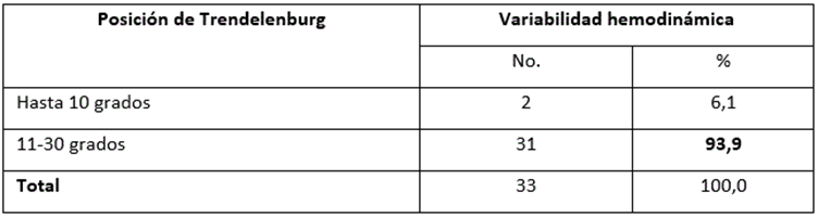 La tabla 5 muestra que los pacientes que se trabajaron en posición de Trendelenburg (cabeza abajo) por encima de 10 grados (entre 11 y 30 grados) presentaron mayor variabilidad hemodinámica (93,9%).