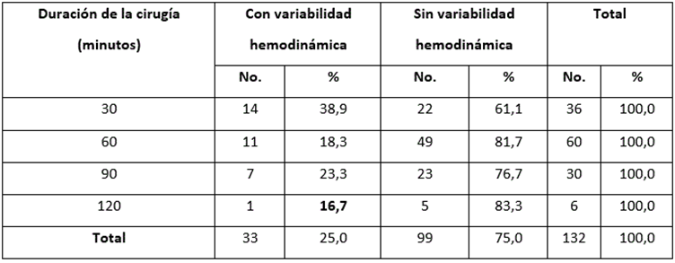 Se ha demostrado que la duración de la cirugía en los ancianos puede incrementarse a causa de múltiples factores, pero en este estudio no se encontró correlación entre este factor y la hemodinamia, ya que los pacientes en los cuales se emplearon los mayores tiempos quirúrgicos fueron los que menos sufrieron variabilidades hemodinámicas.