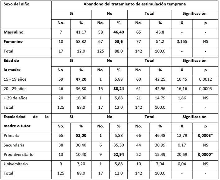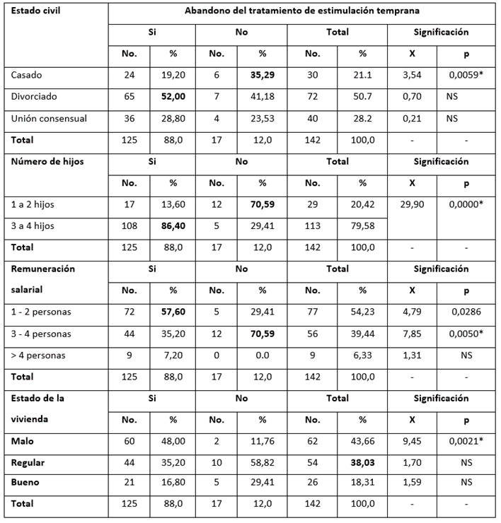 En la tabla 2 se observa significativamente cómo en la medida que aumenta el número de personas con remuneración monetaria, disminuye el porcentaje de retirada del tratamiento de estimulación temprana, expresado en el grupo de (3 - 4 personas), las que no abandonaron el tratamiento en un 70,59 % (x2= 7,85 p = 0,0050). El mayor porcentaje de los pacientes que abandonaron el tratamiento de estimulación temprana, tenían malas condiciones del estado de la vivienda en un 48,00% (x2 = 9,45 p = 0,00021).