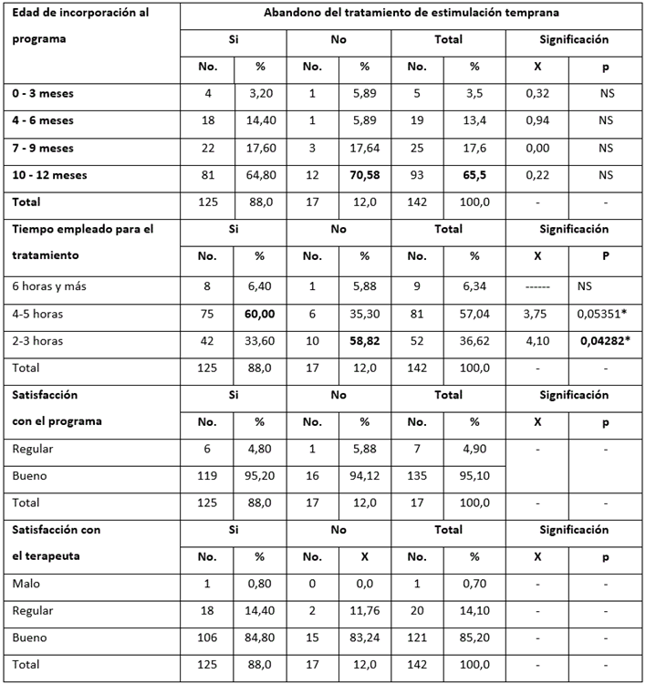 Se muestra en la tabla 3, que predominó la incorporación tardía al programa (10-12meses) en el 65,5% del total de los niños. No existieron diferencias significativas entre el grupo que abandonó el tratamiento estimulador (64,80%) y el que no lo abandonó (70,58%).