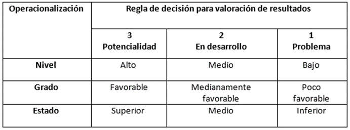 El nivel se refiere a una valoración cualitativa y se aplica en indicadores de todas las dimensiones; el grado es cuantitativo, se empleó fundamentalmente para la superación y el estado en una combinación de aspectos cuali-cuantitativos, utilizado en los indicadores contenidos en la dimensión de investigación e innovación. (Tabla 1)