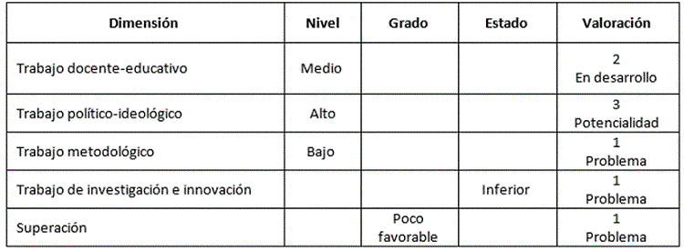 Los problemas más significativos dentro del trabajo docente-educativo están en relación con la planificación del trabajo autónomo en el trabajo metodológico, en la integración de contenidos, el aprovechamiento de las TICs y la utilización del idioma inglés; en la actividad de investigación e innovación, la producción científica y utilización de fuentes de información en la superación profesional y la autosuperación. Se encuentran potencialidades en las dimensiones de trabajo docente-educativo, político-ideológico y la participación en actividades metodológicas.