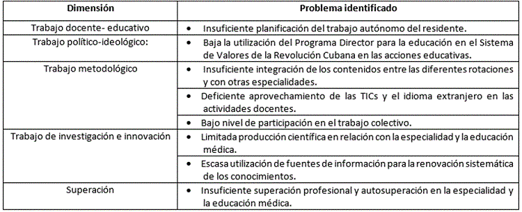 Resultados: La triangulación metodológica permitió identificar como problemas: insuficiente planificación del trabajo autónomo, deficiente aprovechamiento de las TICs y el idioma extranjero, limitada producción científica, insuficiente superación profesional y autosuperación en la especialidad y la educación médica. Como potencialidades se identificaron: el trabajo educativo del profesor, dedicación demostrada y contribución a la formación de los residentes como ciudadanos y profesionales.
