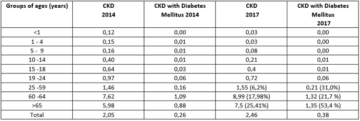 The prevalence of CKD patients from 60 to 64 years reached the maximum rate 8.99 per 1 000 inhabitants, (With regard to 2014, the increase was 17,98%). The prevalence of CKD patients with Diabetes Mellitus was 1.32 per 1 000 inhabitants (An increase of 21,7% with regard to 2014).