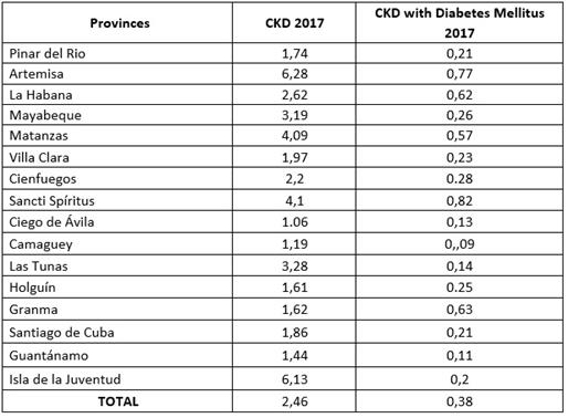In Cuba, the prevalence of CKD patients registered in the PHC was 2.16 per 1 000 inhabitants and the prevalence of CKD patients with Diabetes Mellitus was 0.48 per 1 000 inhabitants in 2015.9