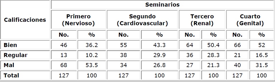 Los seminarios de cardiovascular y renal donde aumentó la frecuencia de estudiantes con calificación Bien, también se observó una disminución de las evaluaciones de Mal. Las cardiopatías son difíciles de entender y más cuando son complejas, pero tienen la característica que es más fácil para el estudiante la comparación del corazón normal con el malformado, lo mismo sucede con la descripción de los defectos del sistema renal porque el estudio de sus características anatómicas es más fácil de comprender.