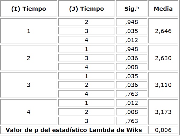 Al aplicar la prueba de análisis de varianza de medidas repetidas dio como resultado que existen diferencias estadísticamente significativas entre los resultados de las evaluaciones a través del tiempo (p=0,006<0,05). El resultado del Tests of Within-Subjects Contrasts dio que existe una tendencia lineal creciente (pendiente positiva) estadísticamente significativa en los resultados de los seminarios a través del tiempo (p=0,002<0,05)
