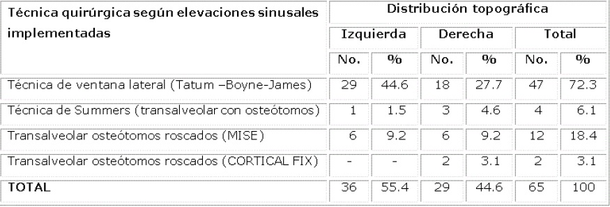 En la muestra estudiada tratada mediante elevaciones sinusales, predominan pacientes con edades comprendidas entre 30 y 39 años, y del sexo femenino. La técnica de abordaje mediante ventana lateral es la más implementada y el seno maxilar izquierdo el más intervenido. La tasa de éxito de los implantes posicionados es alta; se produce su mayor número de pérdida entre 13 y 18 meses de su colocación. La técnica que más logra la reducción en altura sinusal es la de ventana lateral manteniéndose estables los valores obtenidos tras 12 meses del injerto. La mejor relación entre altura de implante y del material de relleno la exhibe el βfosfato tricálcico, aunque el injerto mixto muestra más estabilidad. La complicación más reportada es la pérdida de implante en el sitio injertado, aunque su valor es bajo.