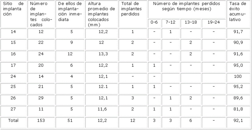 La Tabla 3 nos presenta la distribución de implantes posicionados según sitio y altura promedio de implante, tiempo y número de implantes perdidos en zonas con elevación sinusal. La altura modal de implantes colocados fue 12; se colocó mayor número de implantes en zona del 26 con 29 implantes. Se perdieron del total implantado 12 implantes, para un total de éxito acumulativo a los 24 meses de 92,1%; se reportó el mayor número de perdidas entre 13 y 18 meses después de la elevación