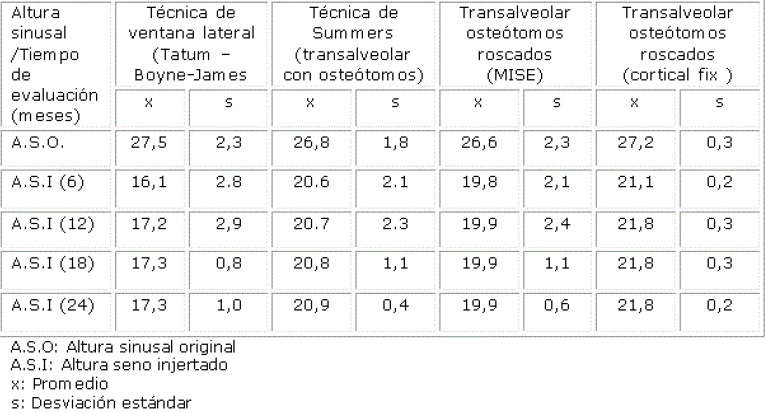 La Tabla 4 exhibe los valores promedio de altura sinusal original y de seno injertado acorde con tiempo de evaluación, y técnica quirúrgica implementada; se aprecia mayor reducción de altura sinusal en la técnica de ventana lateral con una reducción de 11,4 mm de la altura; se aprecia que dicha reducción disminuyó hasta los 12 meses posteriores a la elevación; se mantuvo estable tras un año de la misma con una reducción final en altura de 10,2 mm con escasa dispersión. Las reducciones en altura de las técnicas transalveolares fueron inferiores, pero sus resultados exhibieron mayor estabilidad tras 6 meses del injerto.
