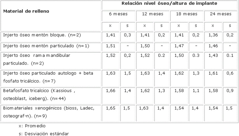 La Tabla 5 exhibe la relación existente entre nivel óseo postelevación y la altura del implante según material de relleno utilizado y evaluación cronológica. Se aprecia que la mejor relación entre nivel de relleno y altura del implante en la primera evaluación a 6 meses de la intervención se logró en elevaciones con betafosfato tricálcico como material de relleno (1,66). Aunque resulta destacable como injertos mixtos de hueso autólogo particulado y beta fosfato tricálcico presentaron un resultado más estable dimensionalmente para lograr en la evaluación final la mejor relación altura del injerto-altura del implante (1,61) con escasa dispersión.