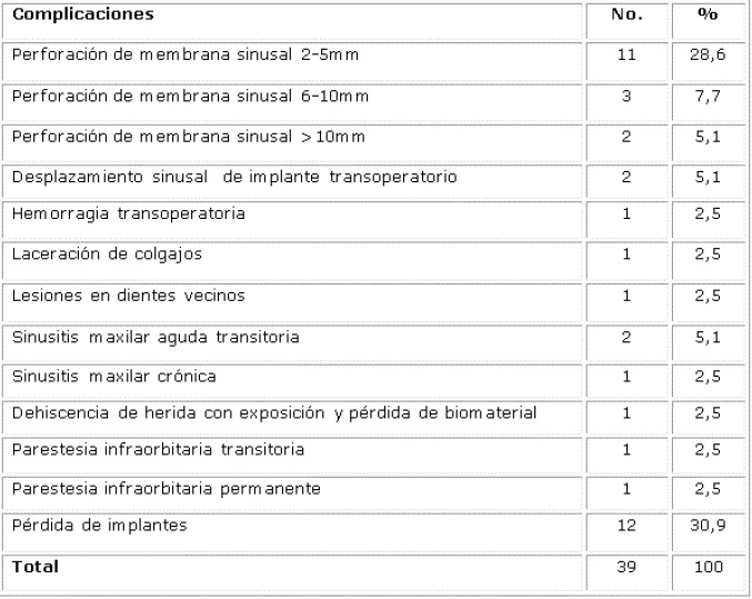 A pesar de los resultados exitosos reportados del proceder, en el momento de la cirugía y tras esta, pueden presentarse ciertas complicaciones; una de las principales, la ruptura de la membrana sinusal. La perforación ocurre, por lo general, con una incidencia comprendida entre 7 y 35% de los casos. Otras complicaciones son la migración del implante al seno maxilar, la fístula oroantral, la hemorragia trasnsoperatoria, la pérdida de vitalidad de dientes vecinos y la sinusitis maxilar.5,6