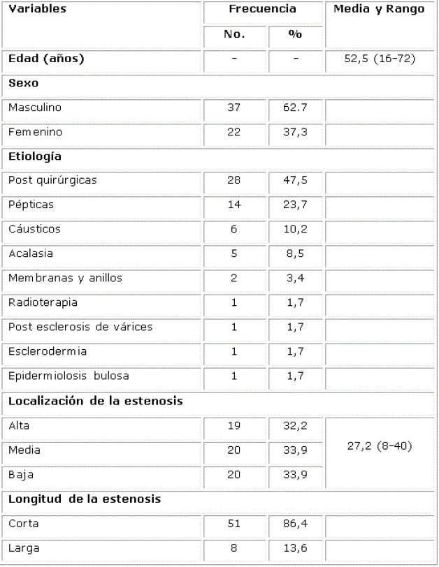 Los criterios de exclusión fueron los siguientes: pacientes con historia reciente de perforación aguda del esófago o fístulas en relación con el área de estenosis; Infarto agudo del miocardio; grandes várices esófago-gástricas y/o con riesgo para desarrollar una hemorragia digestiva inminente; pacientes con divertículos esofágicos por el riesgo de perforación; pacientes con acalasia esofágica; no cumplimiento del protocolo de seguimiento o de las sesiones terapéuticas necesarias. La muestra final quedó conformada por 59 pacientes.
