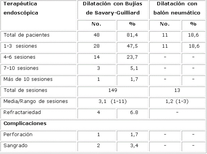 De los 59 pacientes del grupo de estudio, 48 se dilataron con Bujías de Savary-Gilliard para 81,4%, con un total de 149 sesiones, con una media por paciente de 3,1 sesión y un rango entre 1 a 11 sesiones terapéuticas. En este grupo, 47,5% representado por 28 casos, tuvieron mejoría de la disfagia con 1 a 3 sesiones.