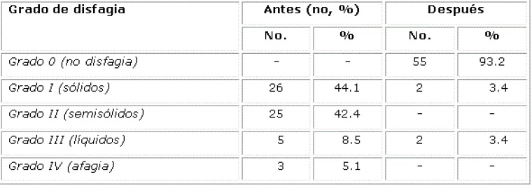 En la Tabla 3 se describe cómo respondieron los pacientes antes y después de las sesiones de dilatación en función del síntoma cardinal que es la disfagia. Antes de comenzar con el tratamiento dilatador 26 (44,1%) pacientes tenían una disfagia ligera solamente a los sólidos; otro grupo importante con 25 (42,4%) afectos referían dificultad para ingerir alimentos semisólidos. Le siguió en orden de frecuencia la disfagia grado III (sólidos y líquidos), representada por 5 (8,5%) enfermos. En la condición más agravante de afagia fueron clasificados 3 (5,1%) sujetos.