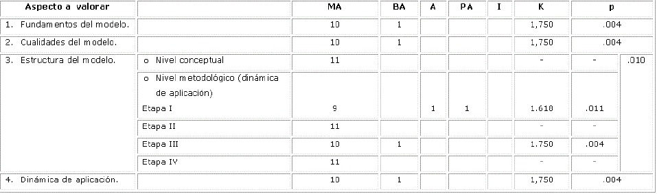En la valoración del modelo, tanto de nivel conceptual como en el nivel metodológico y la dinámica de aplicación, los especialistas lo consideraron muy adecuado y bastante adecuado y resultó estadísticamente significativo. (Tabla 1).