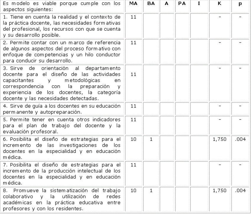 En relación con la viabilidad del modelo, lo consideraron viable porque en su totalidad las respuestas estuvieron entre Muy Adecuado y Bastante Adecuado, lo que también resultó estadísticamente significativo. (Tabla 2).
