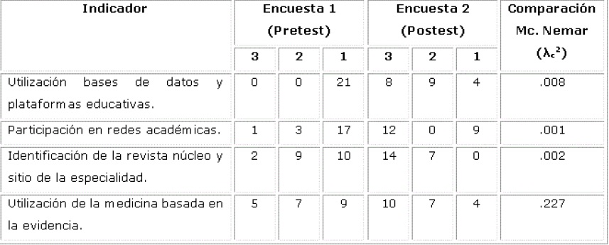 Se muestran cambios significativos en 75% de los indicadores evaluados: Aprovechamiento de las TICs en el proceso formativo por la utilización de bases de datos y plataformas educativas, participación en redes académicas, identificación de la revista núcleo y sitio de la especialidad. En relación con la MBE a pesar de que hay cambios positivos, no son significativos. (Tabla 3).