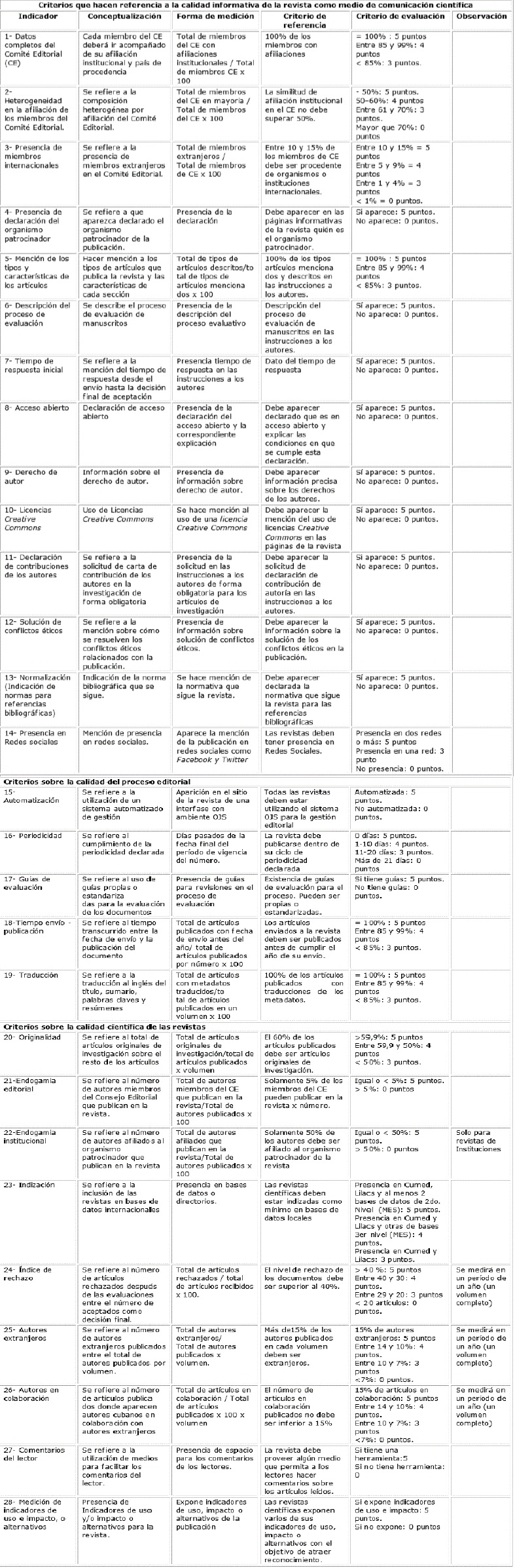 Se diseñaron tres ejes de evaluación, los cuales corresponden a factores claves en la vida de una publicación. El primer eje está determinado por los criterios que hacen referencia a la calidad informativa de la revista como medio de comunicación científica y en él se incluyeron varios indicadores que son indispensables en la información que se brinda al investigador sobre la publicación hasta llegar a 14. (Tabla).