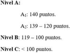 Para el esquema de clasificación se realizó una división en tres niveles o categorías (A, B, C) y dentro de la categoría A quedaron dos subniveles A1, para los que obtengan 140 puntos y A2 para los que obtengan entre 120 y 139 puntos. El nivel B los integrarían las revistas que obtengan entre 119 y 100 puntos y el Nivel C todas las publicaciones evaluadas que obtengan menos de 100 puntos. (Figura).