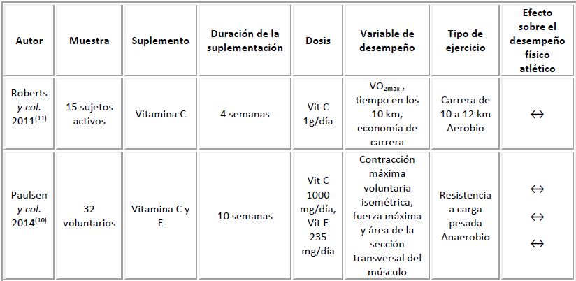 En la tabla 1 se presenta un resumen de los estudios revisados donde investigan el efecto de las vitaminas sobre el desempeño atlético. En el primero utilizan un solo suplemento mientras que en el segundo se administran de forma conjunta vitamina C y E.