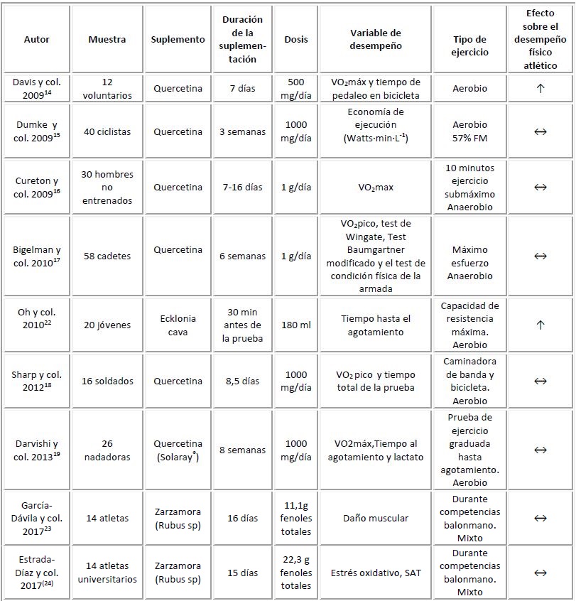 Davis y col.14 llevaron a cabo un estudio con voluntarios en el que tuvieron como objetivo comparar la suplementación con quercetina; observaron que con la administración de este polifenol los sujetos incrementaron su VO2máx y su tiempo de pedaleo hasta la fatiga. En otro estudio con ciclistas, no se encontraron mejoras significativas en la economía de carrera con su ingesta.15 Resultados similares se han reportado en sujetos no entrenados,16 medianamente entrenados17 y soldados.18