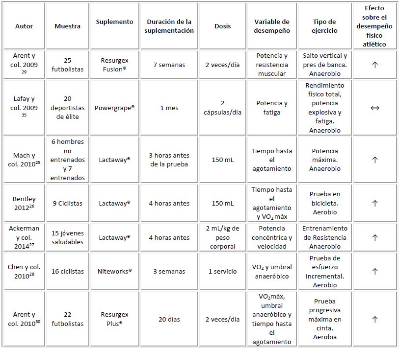 Diversas clases de antioxidantes han sido identificados y cuantificados en las uvas, como los ácidos fenólicos, flavonoides, entre otros. Lafay y col.35 llevaron a cabo un estudio en el que administraron Powergrape (extracto de uva) a un grupo de deportistas y evaluaron los efectos sobre el desempeño físico, aunque no encontraron diferencias en las pruebas, lo cual según los autores se puede deber a la variabilidad de las disciplinas deportivas que practicaban los sujetos. Cuando analizaron los datos por deporte, encontraron que aquellos que practicaban balonmano incrementaron el desempeño físico.