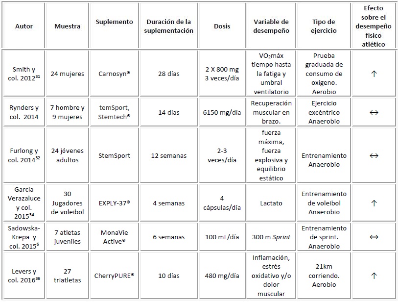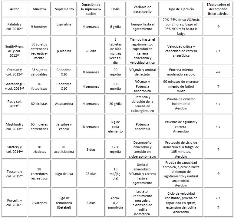 En la tabla 4 se presenta un resumen de los estudios donde se evaluó la efectividad de otros antioxidantes sobre el desempeño físico atlético, se observó que teóricamente favorecen el estado oxidante/antioxidante o reducen el daño muscular por el ejercicio extenuante y por lo tanto se esperaba una mejoría en el desempeño físico atlético, por ser un factor importante en la contracción muscular y la aparición de la fatiga. En la tabla se observan estudios realizados con la Coenzima Q10 y algunos aminoácidos, así como Spirulina y jugo de uva, entre otros. De igual forma, se observa variabilidad en el tiempo de suplementación y las dosis administradas.