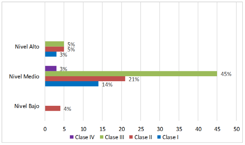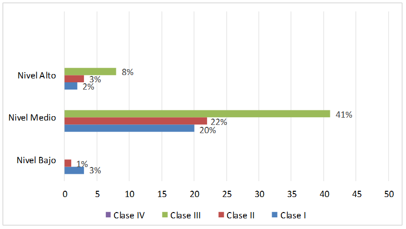 Según el tipo de edentulismo parcial, se observó que en la arcada maxilar predominó la Clase III (50%), de los cuales el 19% fueron del género masculino y el 31% del género femenino. La menor frecuencia de edentulismo parcial en la arcada maxilar se observó en la Clase IV (3%). En la arcada mandibular predominó la Clase III (49%), de los cuales el 16% fueron del género masculino y el 33% del género femenino; en esta arcada hubo una ausencia de la Clase IV (Tabla 2).