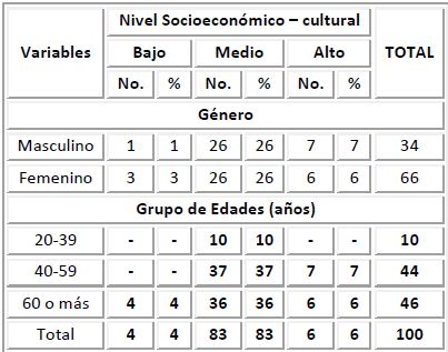 Del total de la muestra (n=100), el 66% fueron del género femenino y el 34% del género masculino. Con respecto al grupo de edades, predominó el grupo de 60 años o más con 46%. Según el nivel socioeconómico-cultural predominó el nivel medio con un 83% (Tabla 1).