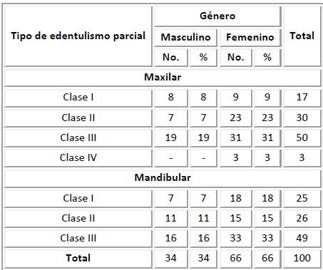 Results: The most frequent type of partial edentulism was Kennedy's Class III in the maxillary arch (50%) and in the mandible (49%), which was mainly present in patients that belonged to the average socioeconomic cultural level (83%). There was no statistically significant association between the socioeconomic cultural level and the type of partial edentulism according to Kennedy´s Class in both dental arches.