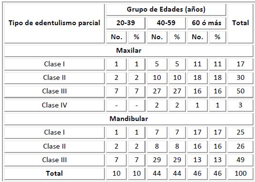 Conclusions: In the studied population, there is a greater frequency of partial bimaxilar edentulism according to Kennedy's Class III and a preponderance of the socioeconomic cultural level. However, there is no association between the type of partial edentulism according to Kennedy´s Class and the socioeconomic cultural level.