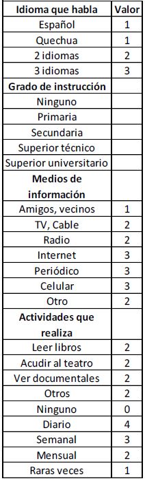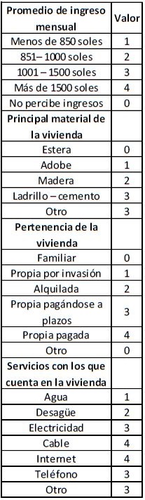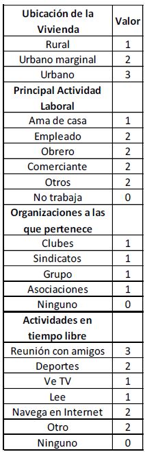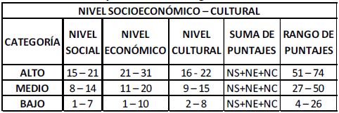 La variable nivel socioeconómico-cultural se dividió en 3 dimensiones con sus respectivos indicadores; dimensión nivel social (lugar de residencia, actividad principal, organizaciones a las que pertenece y actividad más frecuente en tiempo libre), dimensión nivel económico (ingreso mensual, material de vivienda, pertenencia de la vivienda y servicios con los que cuenta la vivienda) y la dimensión nivel cultural (idiomas que domina, nivel máximo de estudios culminado, medios de información y actividad que realiza con frecuencia). Además, se manejaron la variable cualitativa ordinal grupo de edades con las categorías: 20-39 años, 40-59 años y 60 años o más; y la variable cualitativa nominal género, con las categorías: masculino y femenino. Luego se realizó la suma de todos los puntajes de cada dimensión (nivel social, económico y cultural) (Anexo 2) y se determinó el nivel socioeconómico - cultural de los pacientes por medio de su clasificación en 3 categorías: alto (51-74 puntos), medio (27-50 puntos) y bajo (4-26 puntos).