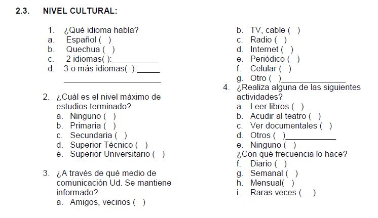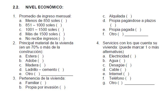 La presente encuesta titulada “Prevalencia del tipo de edentulismo parcial según el nivel socioeconómico - cultural en pacientes de la Clínica de Pregrado de la Facultad de Odontología de la Universidad Nacional Mayor de San Marcos, año 2016” tiene como objetivo recolectar información acerca del Nivel Socioeconómico-cultural exclusivamente para fines de la investigación en mención y con total confidencialidad.