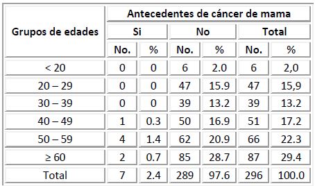 De las 296 mujeres estudiadas predominaron las que presentaban edad mayor o igual a 60 años representando el 29.4 % del total, seguidas por aquellas que presentaron edad mayor o igual a los 50 años con un 22.3 %. (Tabla 1).