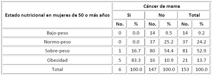 En la Tabla 2 se puede apreciar que el 66.6 % de las féminas con edad igual o mayor a 50 años presentaron estado nutricional entre sobre-peso y obesidad. El 83.3 % de las mujeres de 50 o más años, con cáncer de mama, presentó obesidad como estado nutricional.