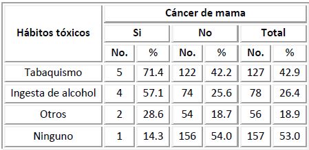 En la Tabla 3 se observan los hábitos tóxicos presentes en las mujeres que residen en el área estudiada y se puede notar que existió predominio del tabaquismo, el cual se halló en el 42.9 % de la población investigada y en el 71.4 % de las pacientes con cáncer de mama.