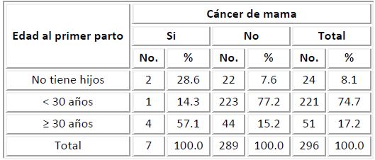 Se puede observar en la Tabla 4, que al momento del primer parto, el 17.2 % de las mujeres de la población y el 57.1 % de las pacientes con cáncer de mama presentaron una edad mayor o igual a los 30 años. El 28.6 % de las féminas con antecedente de la neoplasia, nunca tuvo ningún parto.