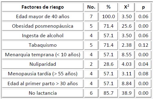 De los factores de riesgo de cáncer de mama presentes en las mujeres afectadas en la población estudiada, se encontró asociación estadísticamente significativa entre dicho tipo de cáncer y la obesidad posmenopáusica, la menarquia temprana, la nuliparidad, la edad mayor de 30 años al primer parto y no brindar lactancia materna.