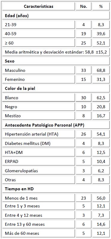Results: A total of 48 deceased were studied at necropsy, representing 48.9% of the total number of deaths within the period. The clinical- pathological correlation was 80.1%. The male sex, the group over the age of 60 years, and arterial hypertension as antecedent of the disease predominated in the study. The most documented method of renal function replacement therapy was hemodialysis which was performed through central venous catheter, 87.8%. The 61.8% of deceased patients received hemodialysis treatment for 3 months or less. Sepsis represented the second cause of death preceded by cardiovascular and cerebrovascular events. However, during the analysis of all the necropsies, the direct or indirect infection associated with the death had a greater frequency.