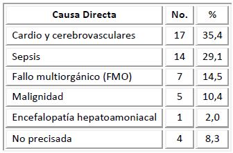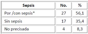 Los fallecidos por sepsis fueron 14 pacientes (29,1%); fue la segunda causa de muerte precedida por los eventos cardio y cerebrovasculares. (Tabla 3)