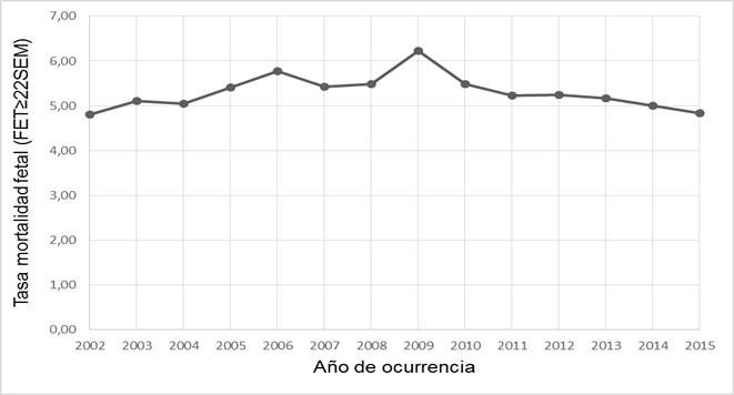 Para el período 2002-2015, ocurrieron 17.952 casos de mortinatalidad y se registraron 225 causas de mortinatalidad de las 236 posibilidades de muerte. La tasa de mortinatalidad se mantuvo estable entre 2002 y 2015 (4,81 a 4,84 por 1.000 nacidos vivos), con una leve alza de 6,22 en 2009; aunque la mayoría de los años se mantuvo en 5,00 o por encima de este valor. También ocurrió un incremento ligero en 2006 que se aproxima a 6,0. (Figura 1). Durante el tiempo de estudio, las macro-causas tipo fetal y desconocido fueron las únicas que aumentaron.