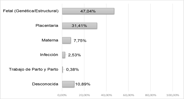 En el análisis propio de las causas, los resultados de esta investigación son coincidentes a la literatura internacional. Los mecanismos de muerte tipo fetal y placentaria son más peligrosos a medida que avanza el embarazo, mientras que las macro-causas maternas e infecciosas no son tan relevantes en fetos peri-término. Existe proporcionalidad directa en la tríada: anomalías placentarias, avance gestacional y mortinatalidad en segundo-tercer trimestre.28