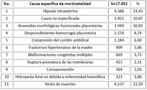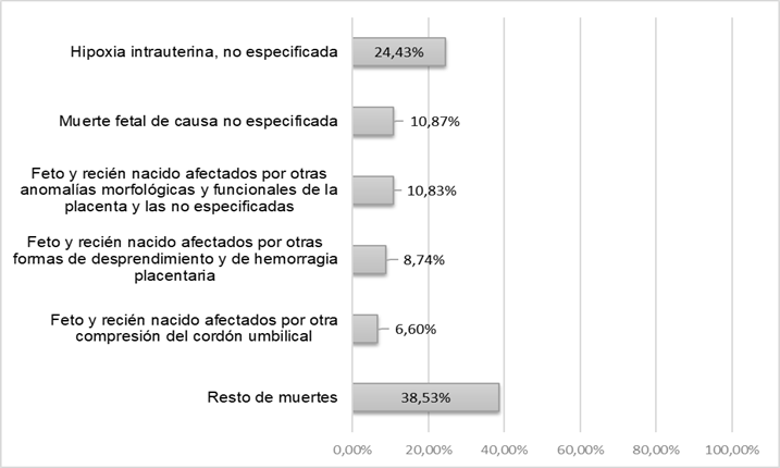 En causas específicas, la mortinatalidad por hipoxia intrauterina está presente en 24,4 % de los casos. Más de 10 % del total de muertes se describe “no especificada”. (Figura 3).